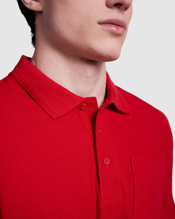 Polo de manga curta com bolso no peito esquerdo. Gola e debruado da manga em canelado 1×1 com detalhe em relevo. Lapela com 3 botões. Tapa costuras reforçado na gola.