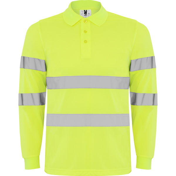 Polo técnico de manga comprida de alta visibilidade. · Com lapela de 3 botões. · Gola e punhos em ponto canelado 1×1. · Duas faixas refletoras. horizontais no dorso e mangas. · Tecido anti engachamento.