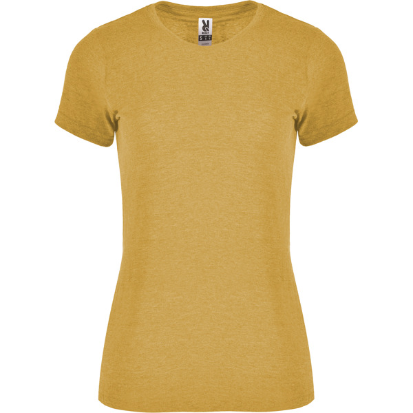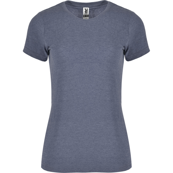 Camiseta de manga curta em tecido com efeito mesclado, levemente ajustada. Gola redonda canelada 1×1 com costuras internas forradas. Costuras laterais.